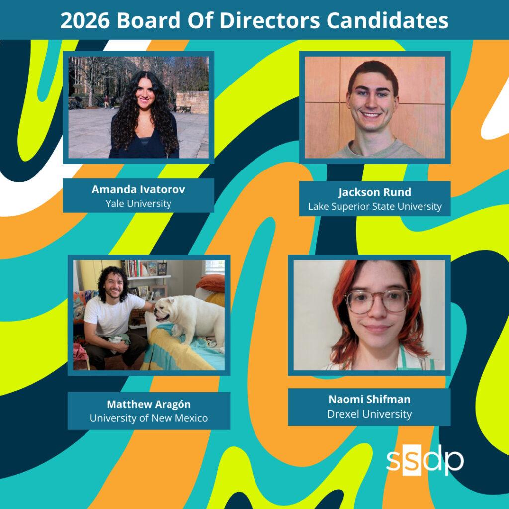 As the largest national youth-led network dedicated to ending the War on Drugs, SSDP thrives on the power of youth leadership. Each year, our members elect new student leaders to the Board of Directors, a vital role in shaping SSDP’s strategy, governance, and impact. Serving on the Board is a unique opportunity to gain hands-on nonprofit management experience while driving meaningful change.